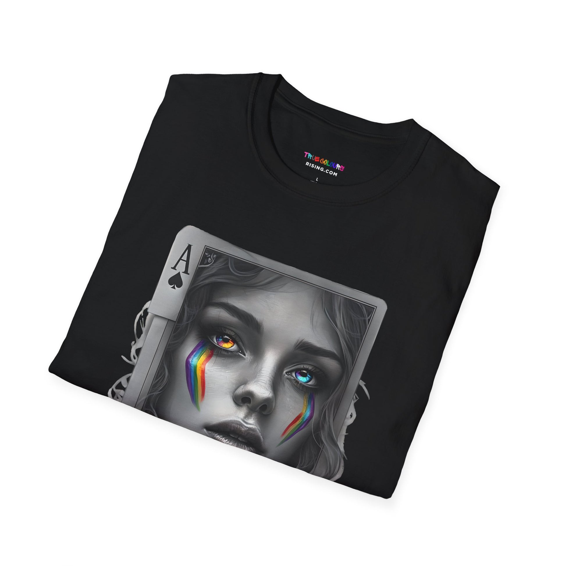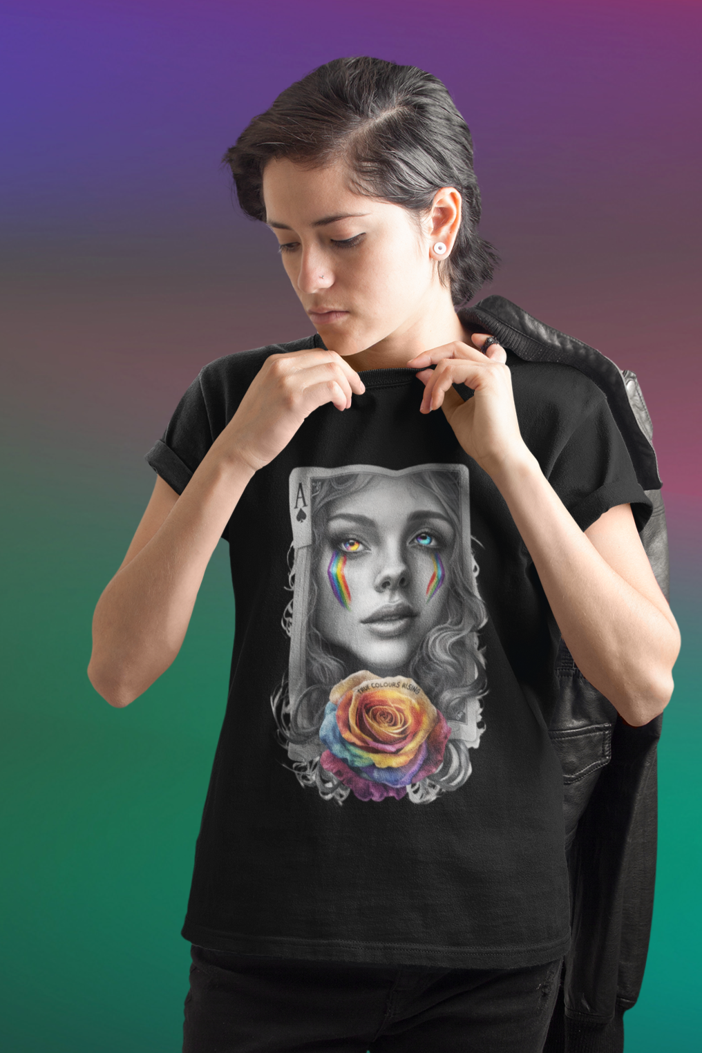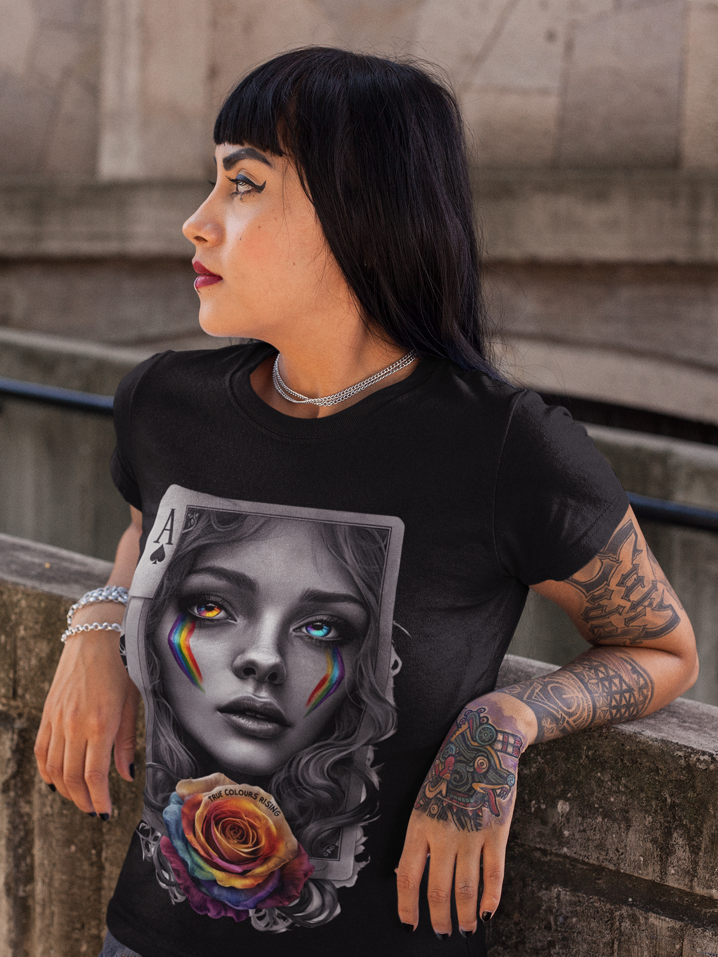 This bold black tee fuses punk rebellion and asexual pride, featuring a fierce femme with rainbow face paint, warrior roses, and the iconic Ace of Spades crown.