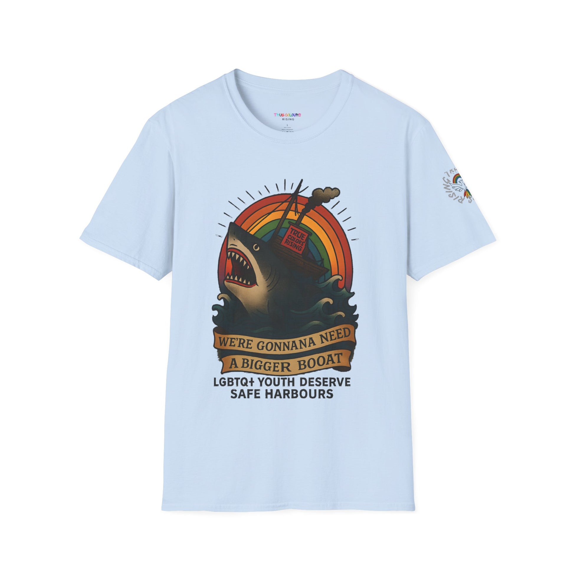 Inspired by the Jaws classic, this bold tattoo-style tee turns a legendary line into a call for action — building “a bigger boat” for LGBTQAI+ youth in need of safety and support.
